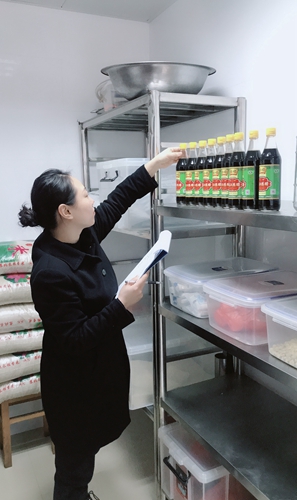 圖為工作人員檢查食堂用品 此外,工作人員每周將不定期對食堂內外環境、倉庫存儲擺放、操作間衛生情況、餐飲具消毒清洗、從業人員采購登記、一日三餐留樣制度等進行檢查,并制定員工就餐登記要求,提前登記用餐人數,改變以往不就餐又不打招呼的現象,大大減少了不夠吃與浪費食材的現象。