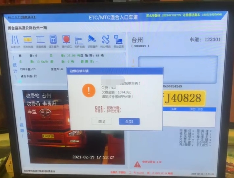 自取消省界收費站全國高速公路聯網后,跨省追繳通行費一直是個大難題,不少司機的省外通行費因無法追繳,造成通行費不斷流失。交通部為了適應“全國一張網”稽核業務工作需要,確保各收費站現場有序處理追繳名單車輛,避免造成社會輿情和人身財產安全事件,研發了全國稽核通行費補費系統。 2月19日晚17點50分左右,臺州收費所進口迎來一輛車牌為浙J開頭的六類貨車,車道屏幕顯示為“浙J XXXXXX追繳名單車輛,欠費4次,欠費金額1074.9元,請同步補繳APP處理?!碑敯嗍召M員見此詢問駕駛員是否欠費,并喊來當班班長張錚過來處理。