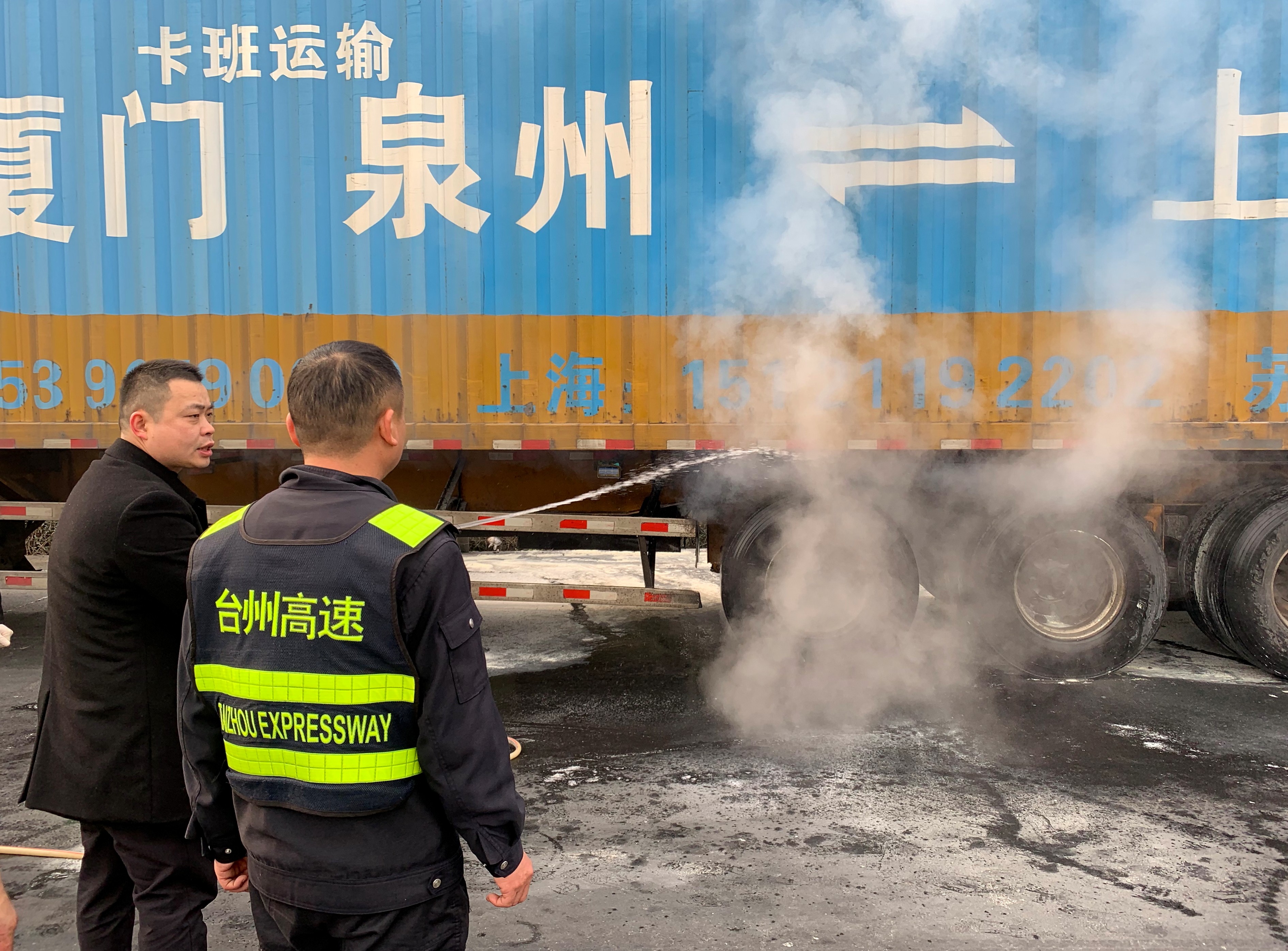 (圖為工作人員奮力救火) 就在這時,突然又一聲巨響, 貨車輪胎發生二次爆炸,火苗再次復燃。但大家絲毫不畏懼,提起滅火器對準著火點,快準狠,火苗再次被撲滅。現場,輪胎處還冒著白煙,監控中心何先林提議利用車道上的兩根水管的水對車輛輪胎進行沖水降溫,避免再次發生爆炸。 經過長達半小時的緊急救援,火勢終于得到控制,無人員傷亡,車輛也沒有造成損失。據了解,該車起火原因是輪胎上有鐵絲,摩擦產熱導致輪胎爆炸起火。 “太感謝了,全靠你們發現,及時止損,不然車就燒沒了。”駕駛員連聲道謝。 在此提醒廣大司乘人員,上高速前務必要對車輛進行全面檢查,特別是輪胎、剎車等重要部位,避免行車途中發生故障導致嚴重后果。 任青青