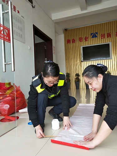 圖為工作人員為營(yíng)造春節(jié)氣氛分工合作 此外,大家在收費(fèi)所宿舍區(qū)、辦公樓、收費(fèi)區(qū)域等地方貼“福”字、貼對(duì)聯(lián)、掛燈籠、插彩旗,以大紅或金黃色為主色調(diào),充分烘托出收費(fèi)所“祥和、喜慶、歡快”的節(jié)日氛圍。