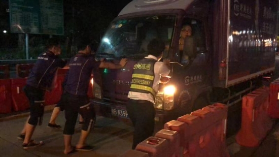 圖為收費員幫助司機將故障車輛推出車道 8月15日凌晨1點多,溫嶺西收費所征費二班安全員在日常巡邏時發現一輛小型貨車停在進口內廣場,在詢問司機后得知車輛因出現故障導致無法發動。安全員當即叫來旁站人員,與兩個司乘人員一起用力,慢慢地將該車推出車道。在婉拒了司機遞香煙的好意后,安全員囑咐司機盡快聯系人員前來解決,后回到崗位繼續工作。