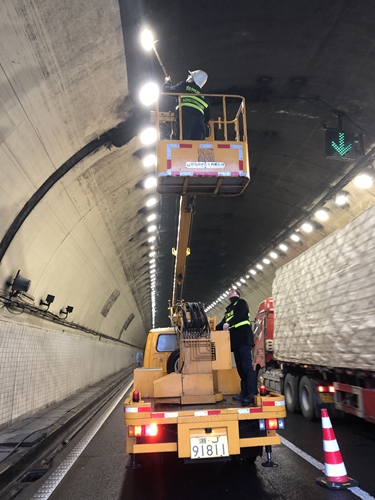 圖為執勤隊在擦拭燈具 原定3月27日的黃土嶺溫向隧道清洗計劃由于天氣原因順延,28日上午,所領導正為隧道能否清洗而發愁, 9點58分只見天空放晴,外面傳來養護車警笛聲,養護封道開始。患著嚴重感冒的李莉拖著疲憊的身子早早準備好一切清洗必需品。 “洪瑞、程常你們一組,一個用餐巾紙擦拭攝像機鏡頭、一個用毛刷刷LED燈具表面,這樣可以節約時間。”隊長叮囑道。 執勤隊有條不紊地開展隧道清洗工作,他們快速地擦拭隧道內每個設備,仔細地檢查每個消防、機電設施。