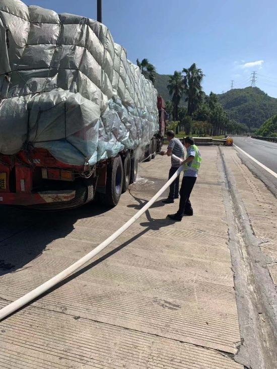 圖為消滅隱患現場 同時,中控員密切關注車輛動向,13:37,中控員在隧道南廣場發現該車,巡邏車立即奔赴現場,該車后輪胎剎車位置在冒煙,司機正用礦泉水澆輪胎,隊員們見狀,火速上前把消防栓打開,接上消防水帶,交與該車司機,托著消防水帶,對準輪胎接連猛射,冷卻剎車片,輪胎終于沒有冒煙,一場隱患被隊員消除了。 據悉,該輛半掛車因輪胎爆炸,引起冒煙,司機卻想著從下一個高速出口,幸好隊員們監控及時,出警迅速,施救到位,把隱患扼殺在搖籃里,沒在隧道內發生火災,不然后果將無法想象。 現場,隊長告知司機,萬一車輛發生火災,請把車停在隧道外,若在隧道內發現車輛起火,請加速駛往隧道口,盡快駛離隧道,避免造成人員傷亡。 陳智慧