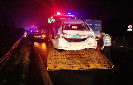 圖為施救車(chē)拖運(yùn)被撞車(chē)輛