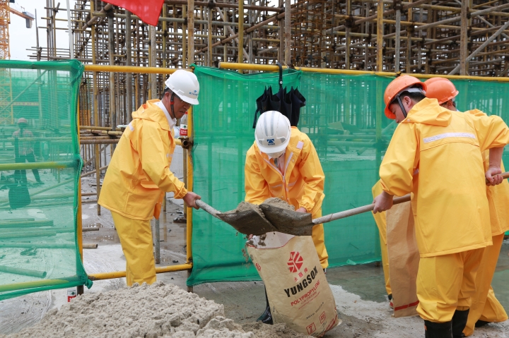 圖為模擬建筑工地面對(duì)洪水倒灌的現(xiàn)場(chǎng)應(yīng)急搶險(xiǎn)