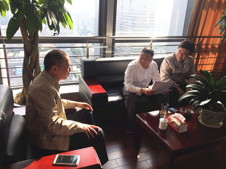 圖為市國資委主任徐豪和集團總經(jīng)理張建平一起走訪市財政局股東單位