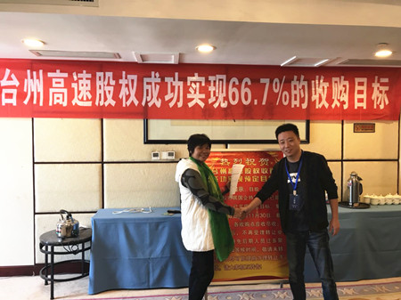 臺(tái)州高速股權(quán)集中和優(yōu)化工作領(lǐng)導(dǎo)小組辦公室主任、臺(tái)州高速集團(tuán)總經(jīng)理張建平鄭重地宣布:“至此,全市共完成臺(tái)州高速股權(quán)轉(zhuǎn)讓6947萬(wàn)股,臺(tái)州市屬國(guó)企及黃巖財(cái)務(wù)開發(fā)公司合計(jì)持股數(shù)1.441億股,完成了66.7%的預(yù)定收購(gòu)目標(biāo)。”