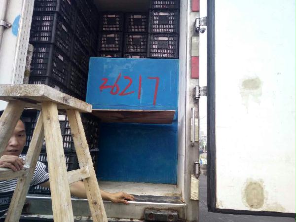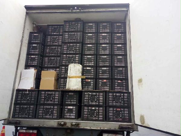 圖為被處罰的車輛 早上10點(diǎn)40分左右,這輛運(yùn)蘋果的貨車駛?cè)胧召M(fèi)站的一號(hào)崗?fù)ぃ緳C(jī)師傅說(shuō)自己運(yùn)的是蘋果,根據(jù)公司規(guī)定,綠農(nóng)車檢查必須開(kāi)車門檢查貨物。憑著多年的檢查經(jīng)驗(yàn),當(dāng)班班長(zhǎng)童軍偉發(fā)現(xiàn)這輛綠農(nóng)車有問(wèn)題,覺(jué)得重量遠(yuǎn)遠(yuǎn)不夠,可能不符合“綠農(nóng)”免費(fèi)政策。果不其然,車廂中“深藏玄機(jī)”,左右兩側(cè)各有一排玻璃鋼魚(yú)箱,這就給檢查增加了難度。當(dāng)班班長(zhǎng)要求司機(jī)師傅把最后兩排箱子拿掉,想檢查玻璃魚(yú)缸,然而這個(gè)司機(jī)極其不配合,還惡意刁難工作人員,說(shuō)什么也不搬蘋果。