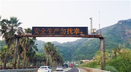 圖為情報板滾動播放安全標語 會議要求在隧道管理所醒目位置懸掛了安全條幅,情報板滾動播放安全標語,提示過往的司機朋友安全出行。同時在隧道所管理上増設安全員崗位,要求安全員嚴格遵循崗位職責,并做好日常巡查記錄表。執勤隊長上崗要帶紅章,既能體現安全員的責任感,又能讓員工看到起警示作用,讓大家時刻拉緊安全這根弦。會后,工作人員按照會議部署立即行動落實。