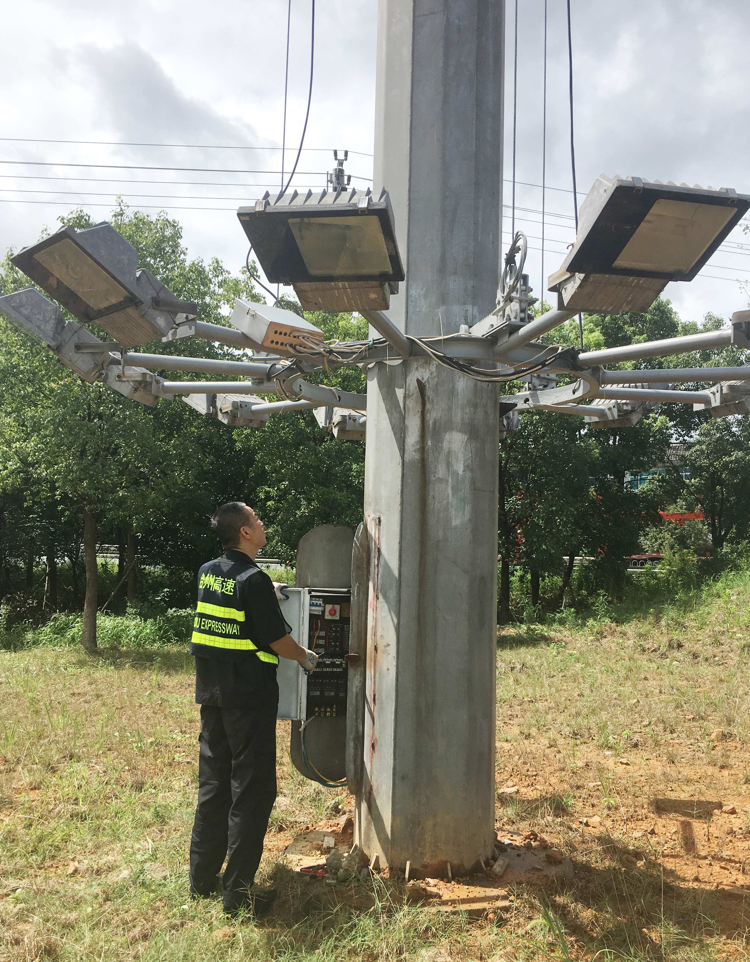 圖為工作人員清除收費頂棚垃圾 及時下降各收費所互通區高桿燈。為提升互通區照明亮度,減少因選錯路口而帶來的不必要的麻煩,集團在各收費站出入口互通區共安裝了11盞40米高度高桿燈,每盞高桿燈上方有12盞鈉燈。倘若這些高桿燈上鈉燈在臺風襲擊下一旦掉落后果將不勘設想。8月8日,中心再次召集各班人員對收費沿線高桿燈進行了下降處理。因高桿燈四周雜草叢生,在下降時維修隊員不僅要忍受底下蚊蟲肆意叮咬,還要克服時而烈日時而大雨的怪異天氣,沒放幾盞隊員便濕透了全身,衣服是濕了又干,干了再濕。