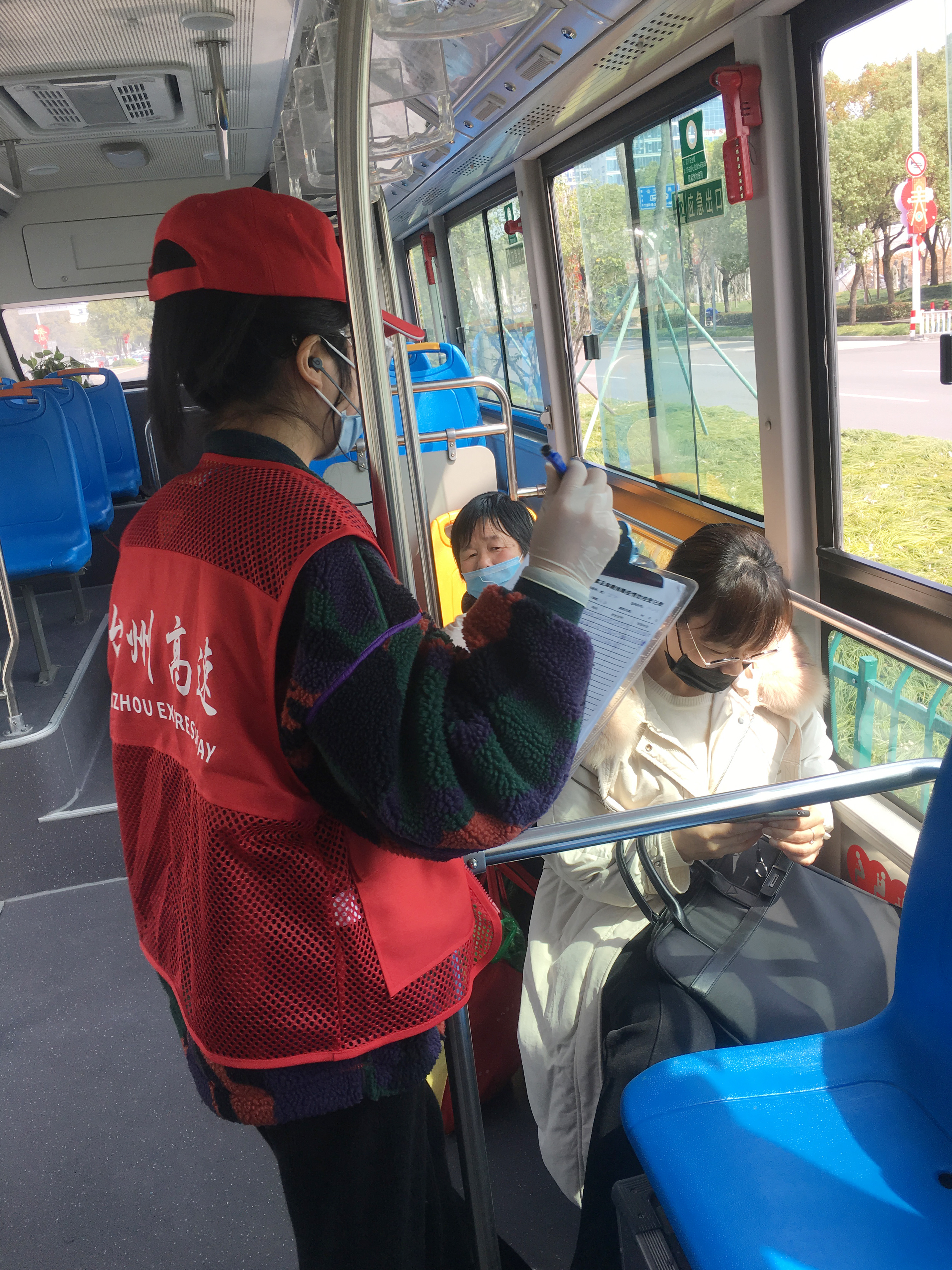 3月18日上午,臺州高速計財部職員毛譯聆早早就到站,一一戴好口罩、護目鏡、一次性手套,提前3分鐘走上所跟的108路班車。一路上,看見有乘客上車,她便等在車門前,量體溫、引導年輕人掃碼自行登記資料,幫助老年人實名登記身份信息,“安檢”通過后讓乘客有序上車,并禮貌勸導乘客間隔而坐,降低病毒感染的風險。