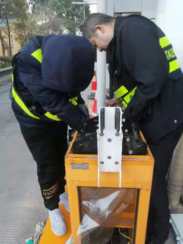 (圖為搶修人員在調(diào)試欄桿機設(shè)備)