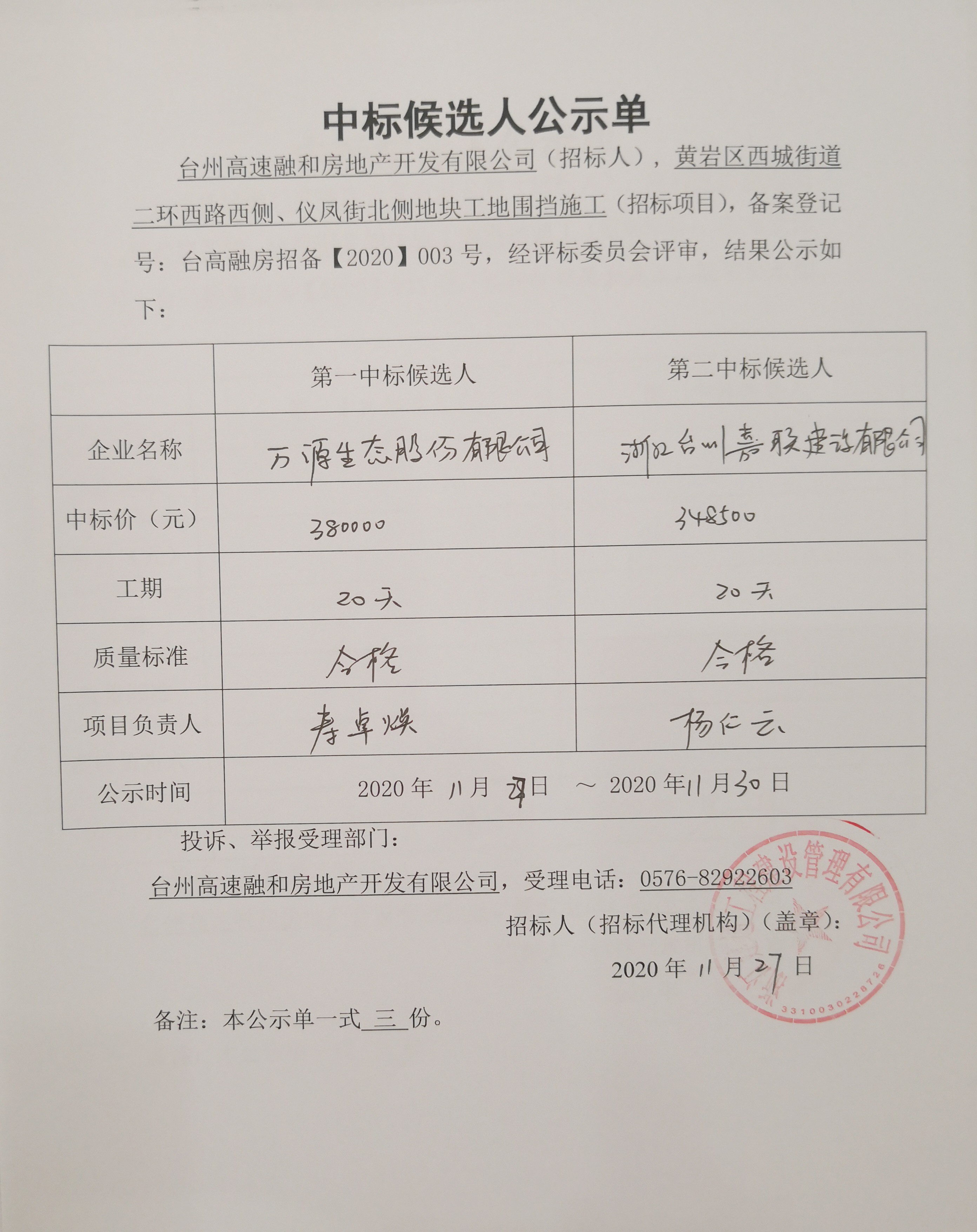 黃巖區西城街道二環西路西側、儀鳳街北側地塊工地圍擋施工(招標項目)中標候選人公示單